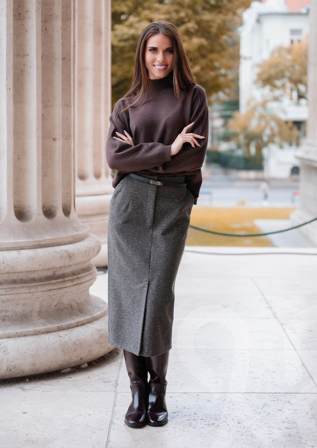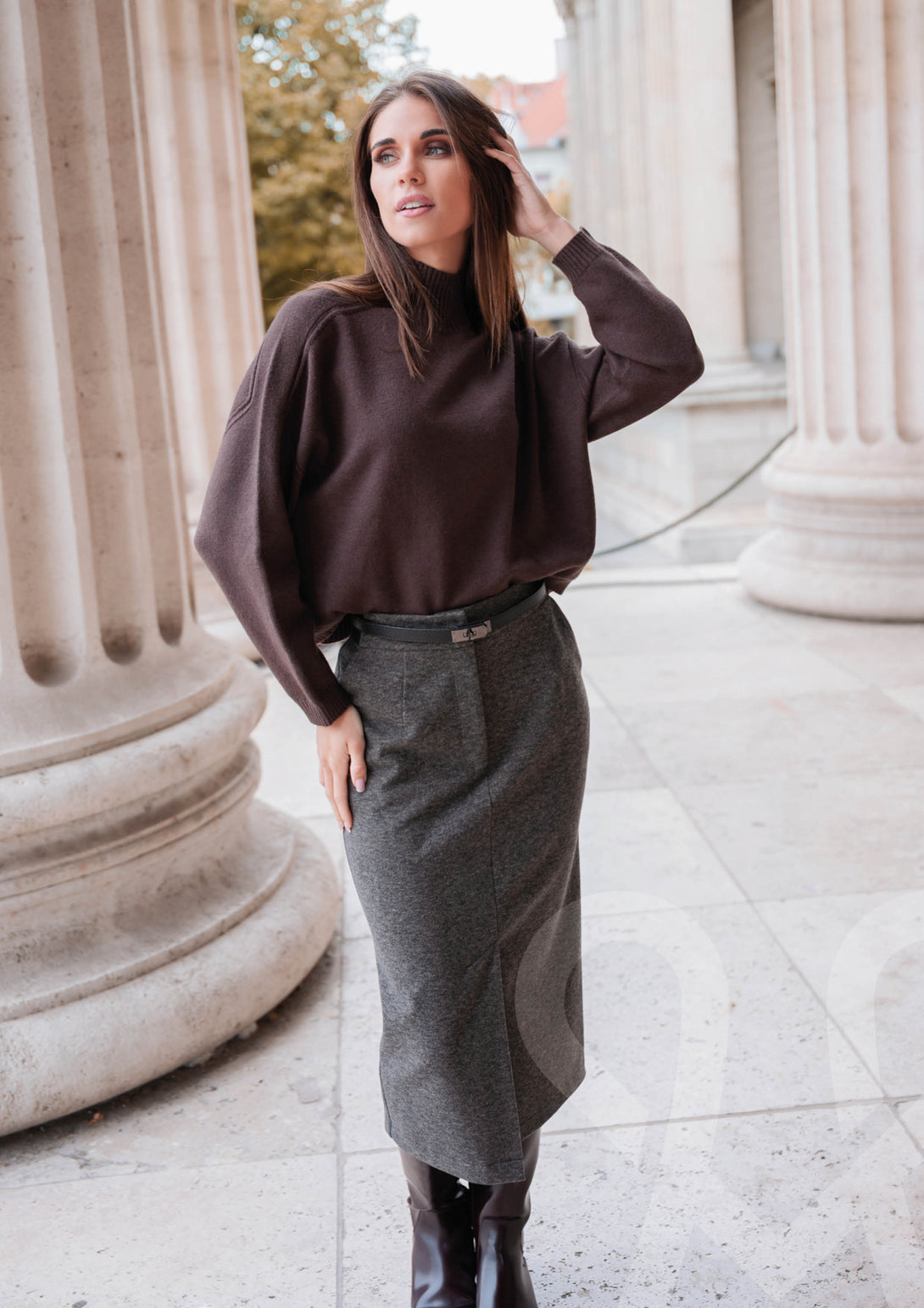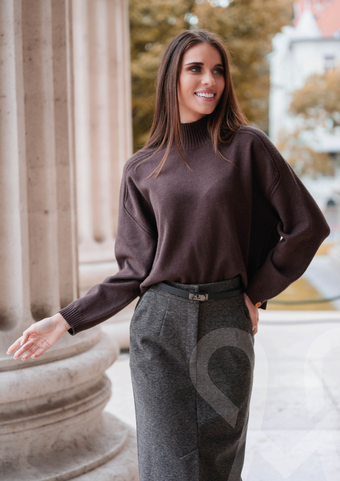 A MAGENTA barna színű, finom kötésű pulóvere letisztult, elegáns alapdarab, amely a mindennapokban és rétegezéshez is tökéletes választás. Az elasztikus, puha kötött anyag kényelmes viselet, szépen követi a test vonalát anélkül, hogy szűk lenne.