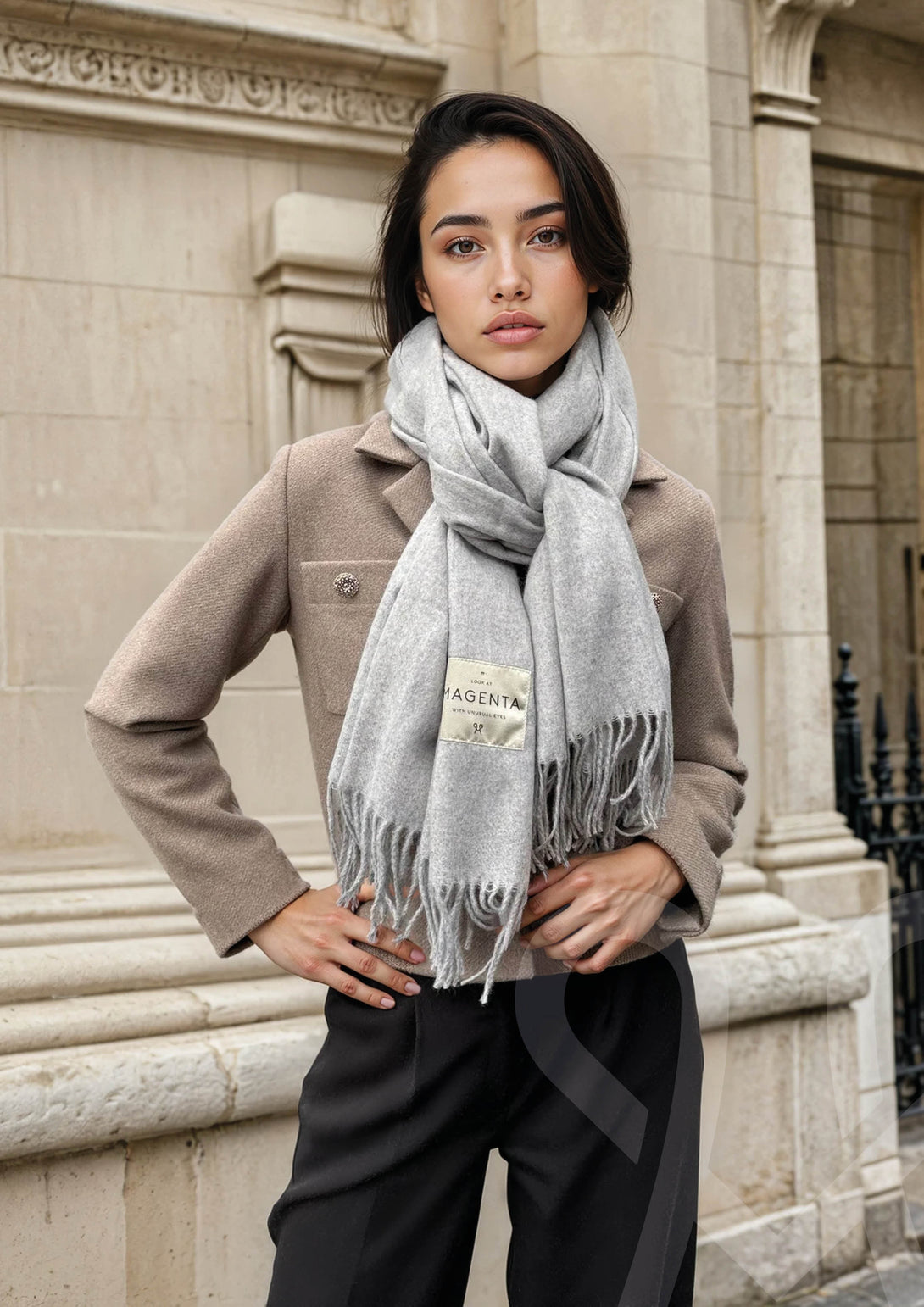 Ez a világos szürke színű MAGENTA kasmír sál puha, luxus érzetű anyagával tökéletes választás a hűvösebb napokra. A finoman rojtozott végződés elegáns, nőies megjelenést kölcsönöz, miközben könnyedén kombinálható kabátokkal, pulóverekkel vagy akár elegáns összeállításokkal.