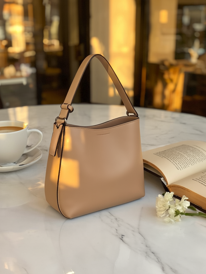 Bézs színű, Magenta műbőr táska, mágneses záródással, belül zippzáras neszeszerrel, oldalán zippzáras zsebbel.