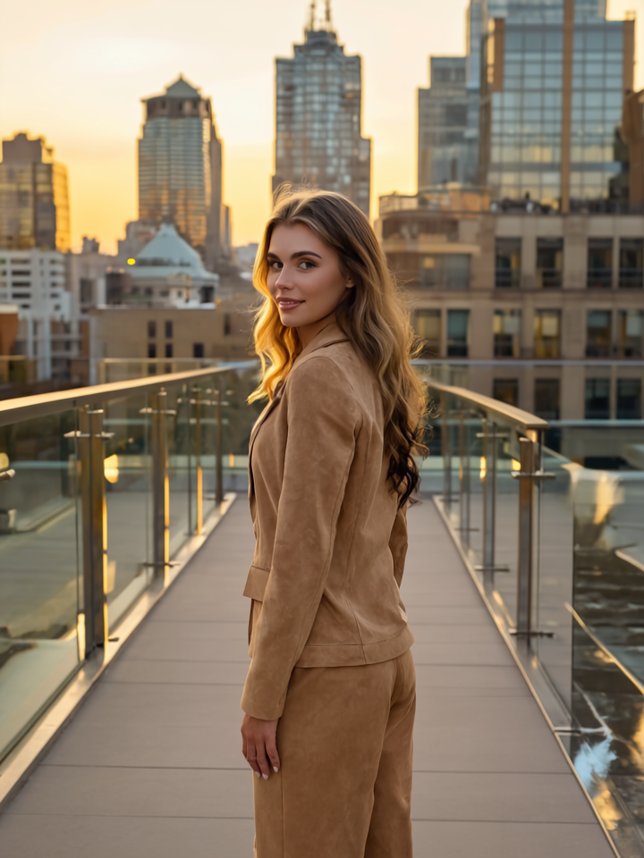 Barna színű, velúr Magenta zakó, karcsúsított fazonú, kihajtós gallérral, elején gombos záródással.